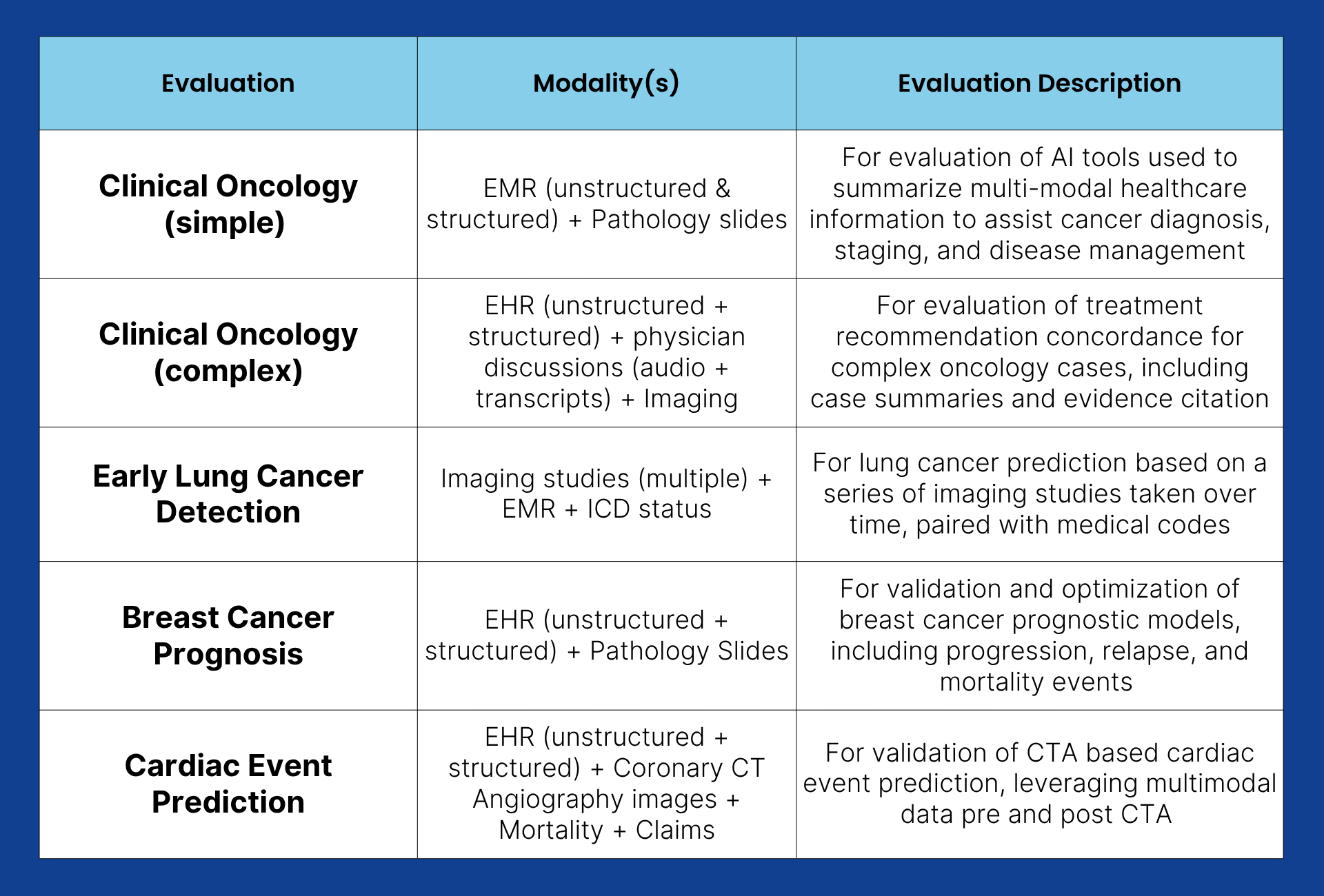 Protege’s initial evaluation datasets cover use cases in Clinical Oncology (simple), Clinical Oncology (complex), Early Lung Cancer Detection, Breast Cancer Prognosis, and Cardiac Event Prediction.