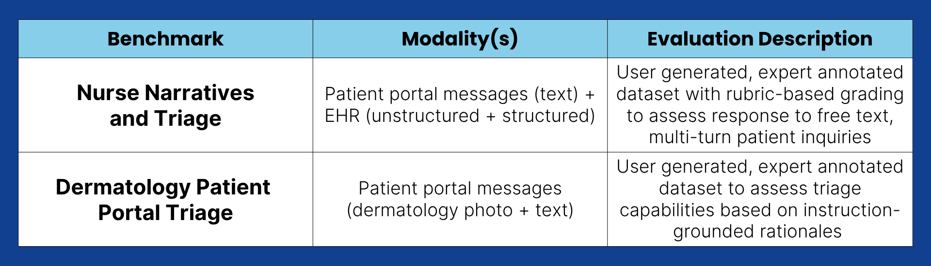 If the medical provider only had one of these, they would have an incomplete picture, and the same is true for evaluating any healthcare AI model for clinical diagnostics and support. Even so, the Protege Data Lab found that less than 10% of all healthcare benchmarks are multimodal, such as combining notes, imaging, and structured health data.